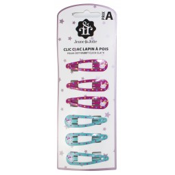 Une barrette clic-clac trop mignonne avec son motif lapin à pois, parfaite pour maintenir les petites mèches et embellir les coiffures enfantines.